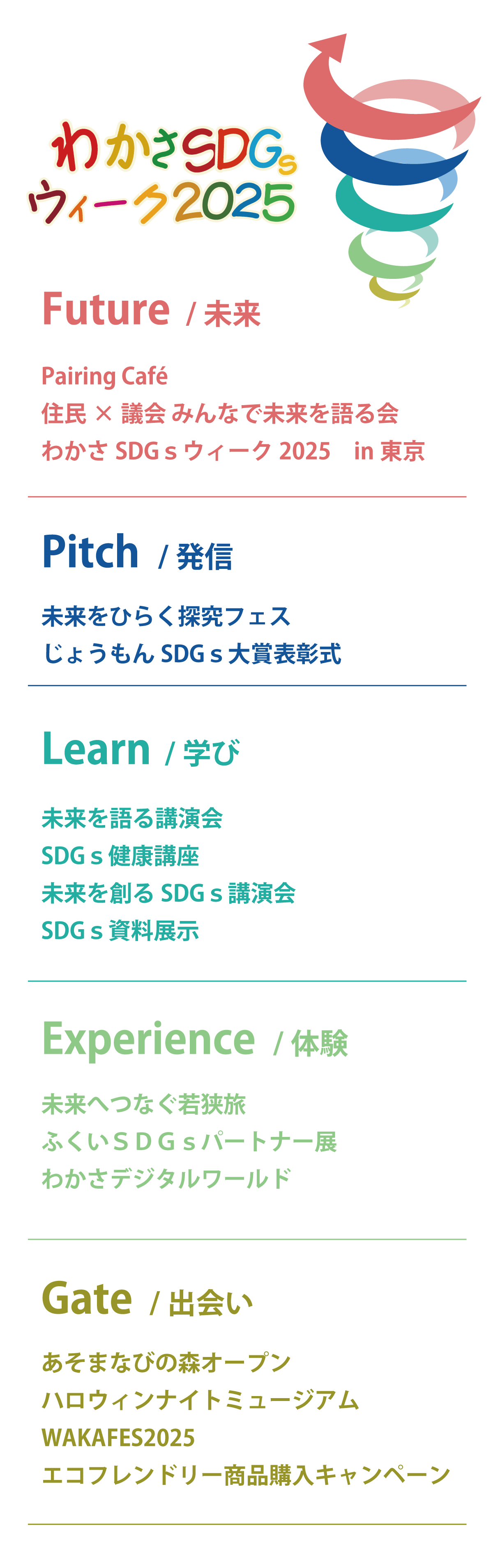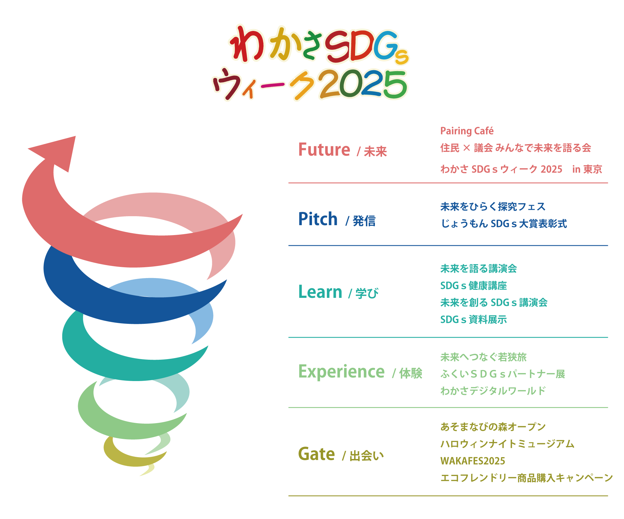 若狭町民が、SDGsの目標達成に向け「出会い」「体験」「学び」「発信」「未来」というテーマを通じて、「知っている」から「やってみる」へと行動変容を行い、小さな一歩の積み重ねから持続可能なまちの未来をつくる。