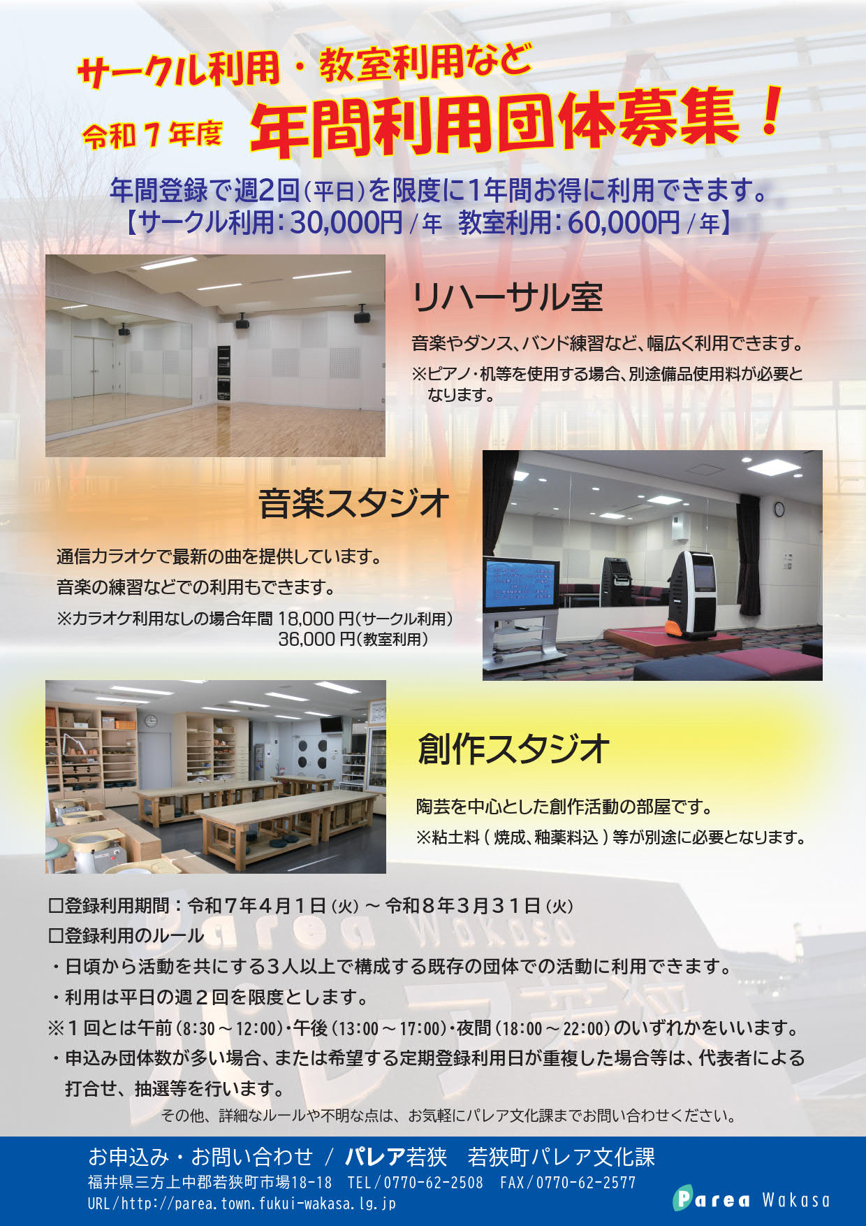パレア若狭では、3名以上のサークル・教室であれば、「リハーサル室」「音楽スタジオ」「創作スタジオ」を、週2回(平日)を限度に1年間使用できる、大変お得な制度「年間使用登録」があります。ぜひご活用ください。