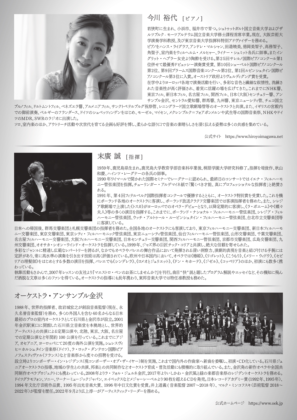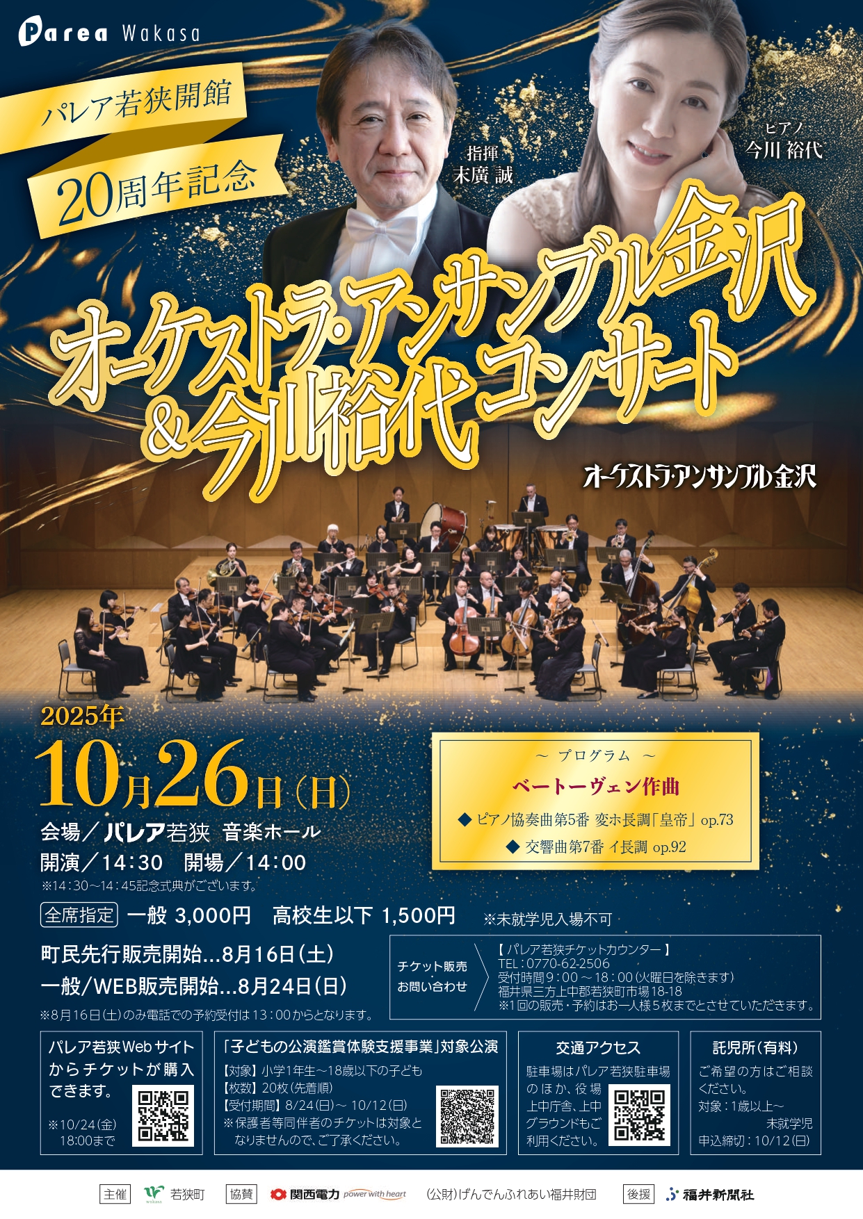 パレア若狭開館20周年を記念して若狭町出身のピアニスト今川裕代とオーケストラ・アンサンブル金沢による記念コンサートを実施します。指揮は、世界的評価も高く、様々なジャンルで活躍する末廣誠となります。世界で活躍する一流奏者たちの共演を楽しむと共に、クラシック音楽の魅力にふれてみてください。
