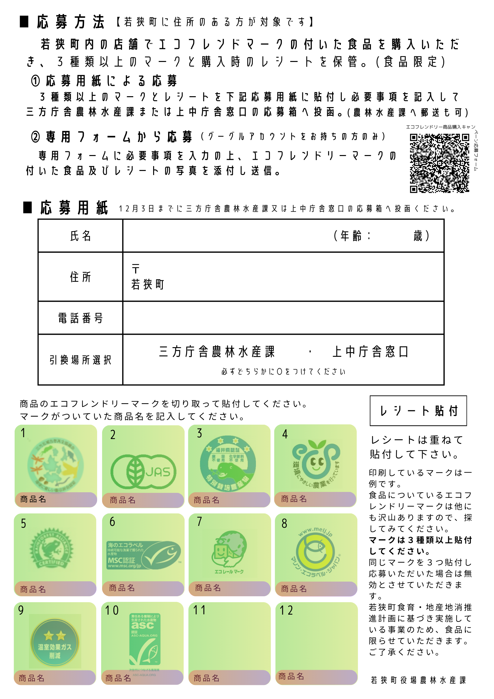 2. 応募用紙に必要事項を記入の上、エコフレンドリーマークとレシートを添付し、三方庁舎農林水産課、上中庁舎窓口に設置している応募箱へ投函